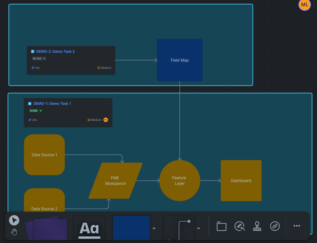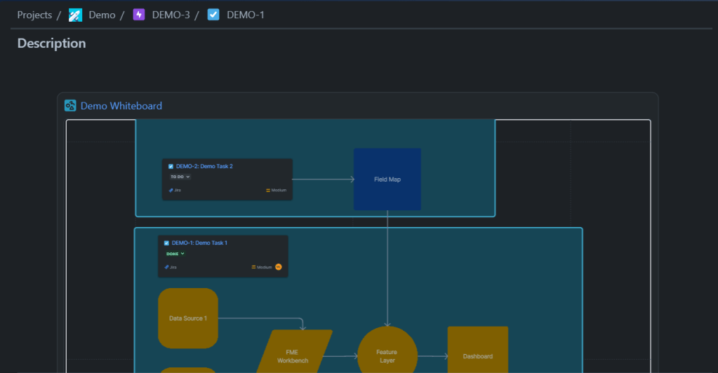Moreover, each item within a Whiteboard can have its own link, allowing you to reference specific sections of even the largest Whiteboards. These links can be added to Jira Work Items or Confluence Pages, creating a powerful way to connect visual elements directly to related documentation or tasks. This level of integration enhances navigation and collaboration, making Whiteboards a valuable addition to your Geospatial Program.