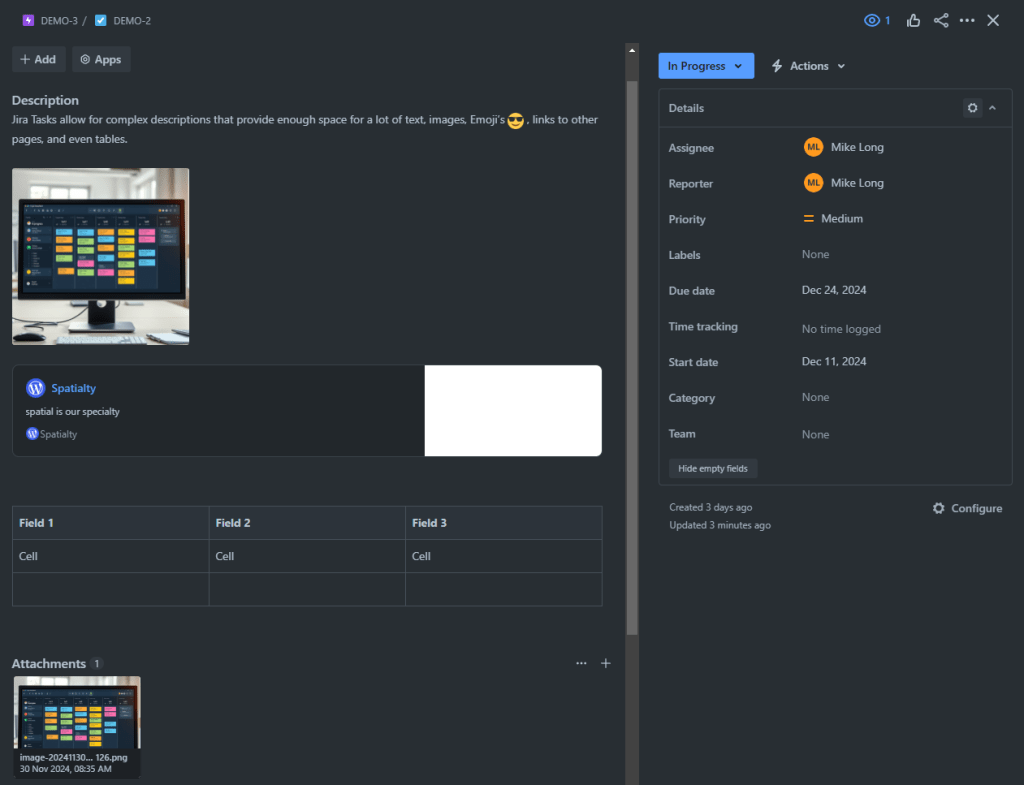 Jira’s description field is incredibly spacious, accommodating up to 32,767 characters. This provides ample room to store detailed information about a task, including text, emoji’s, links to Confluence documentation or other web pages, images, and even Whiteboards (more on this later).