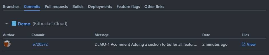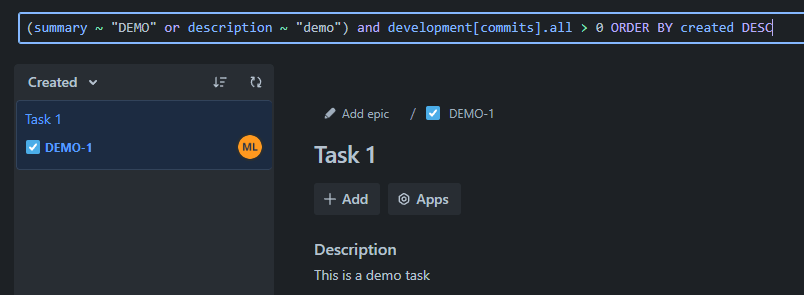 Example of Jira Query Language (JQL) finding tasks with the word “demo” in the Summary or Description, and with at least one linked commit.