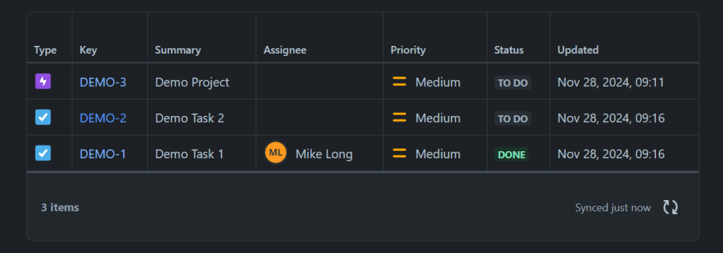 Below is an example of adding a Jira Search Element to a Confluence page. This element has been configured to search for Work Items with the word “Demo” in the summary. This table is refreshed each time the page loads keeping an up-to-date list of tasks as thy are created in Jira. The search terms can be quite advanced if desired, they can even use Jira Query Language (JQL).